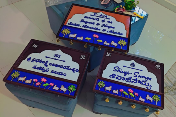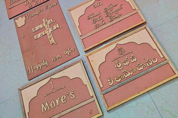 At Ambikamber, we specialize in creating exquisite name plates, excelling in designing personalized, high-quality pieces that leave a lasting impression. While name plates remain our signature expertise, we also offer a wide range of customized interior décor products. From cushion covers, pillow covers, bed sheets, and curtains to wall décor, mantra boards, key holders, keychains, wall galleries with photo frames and positive messages, kitchen frames, café décor, temple wall accents, and more, we bring every idea to life—from concept to a fully finished product.