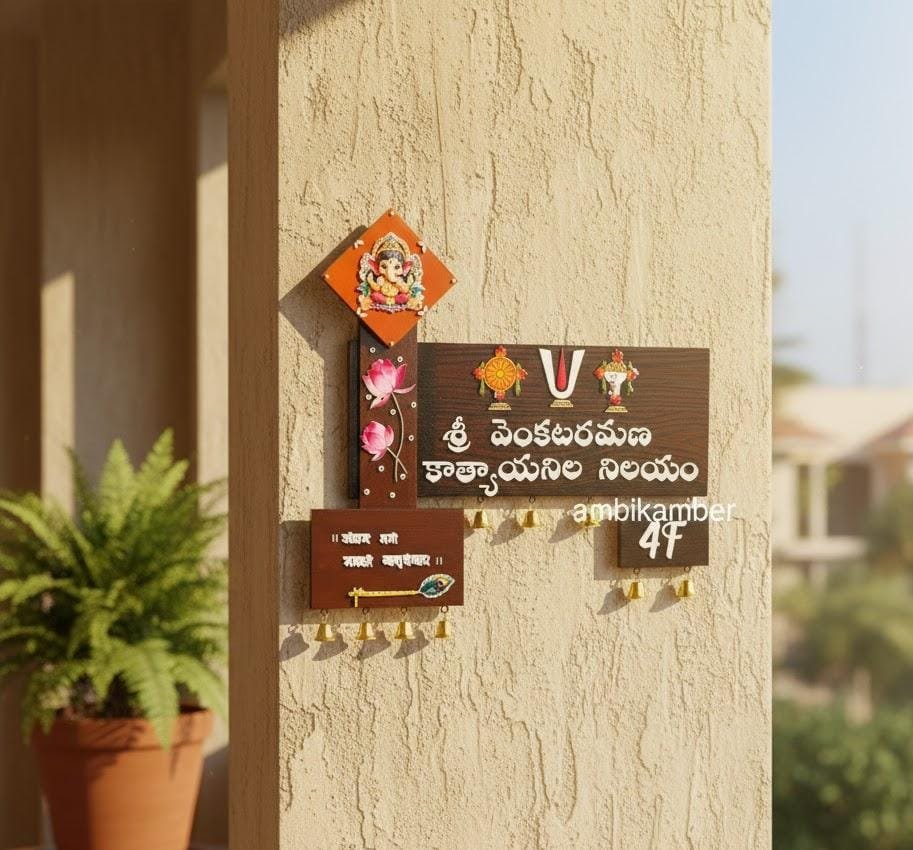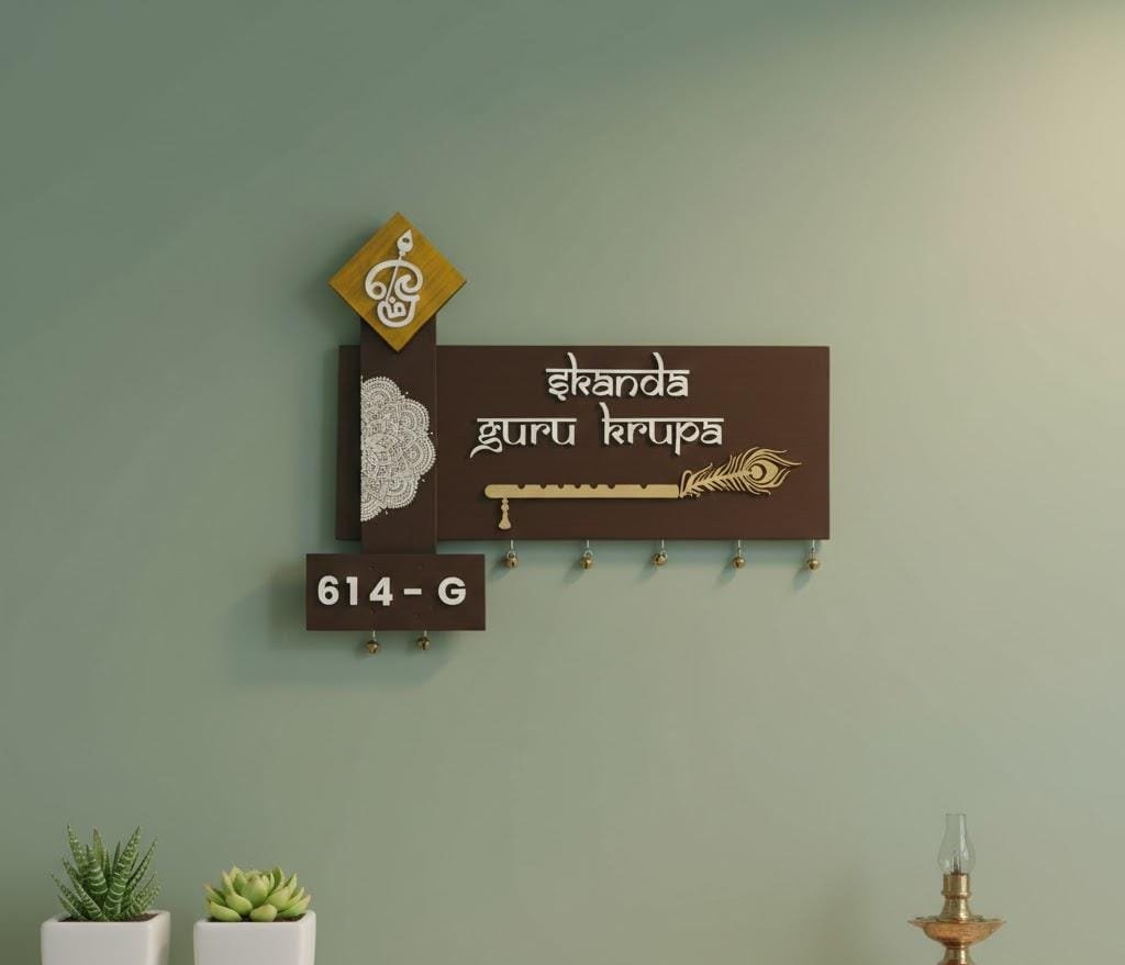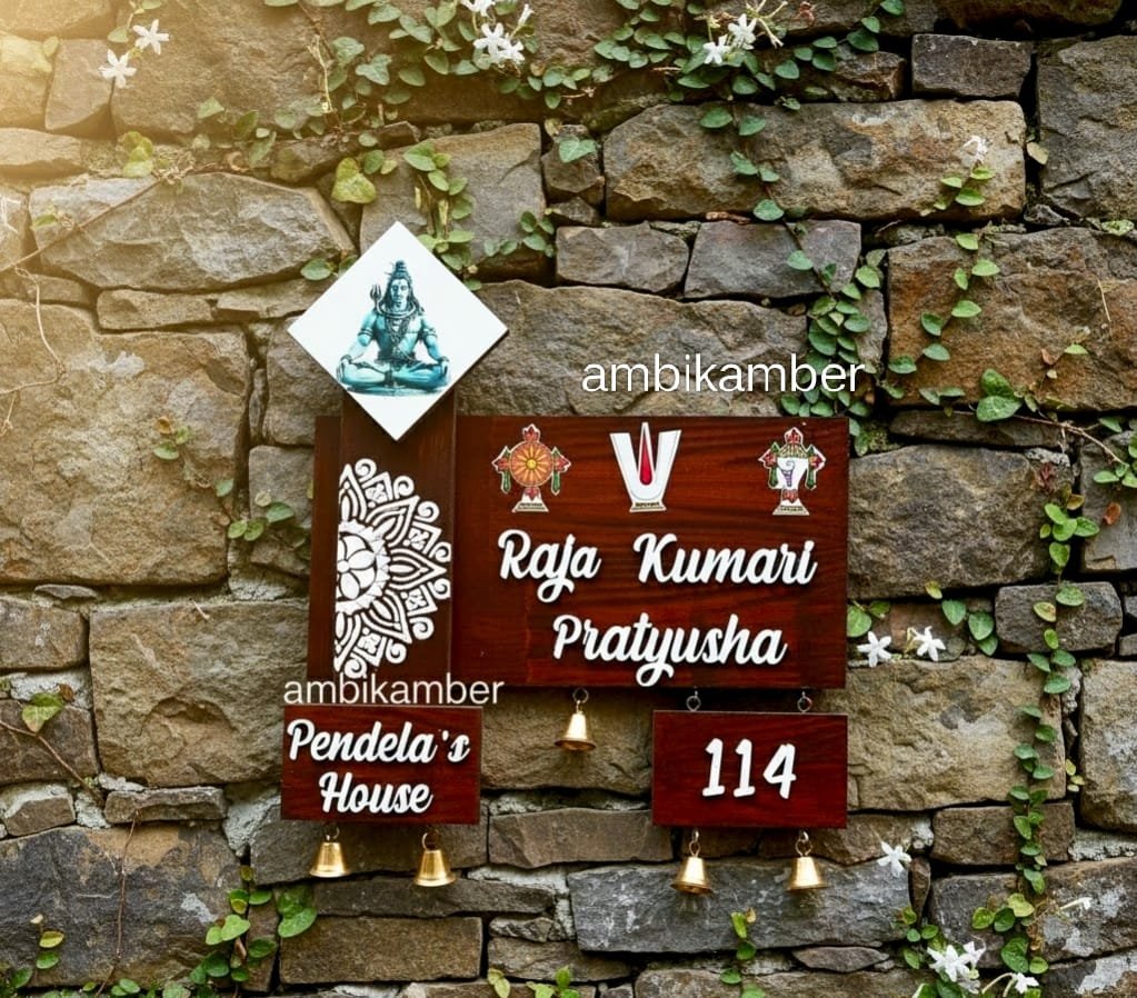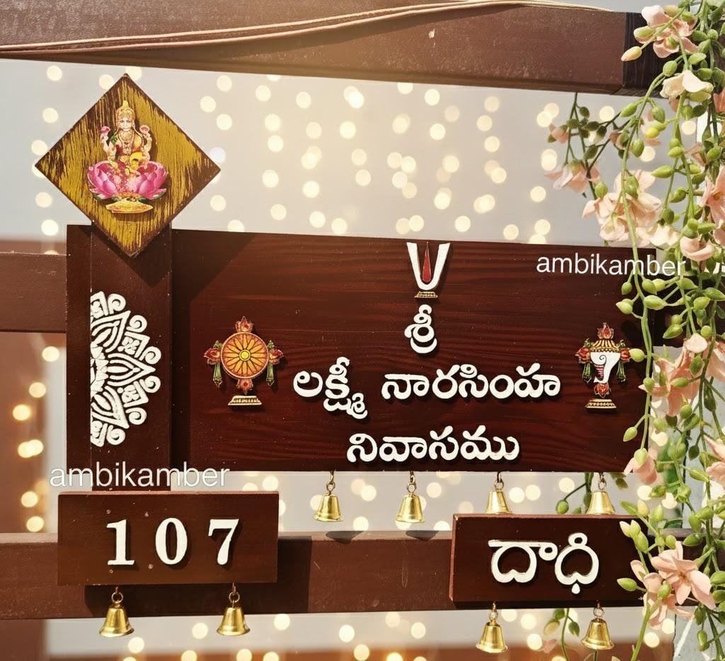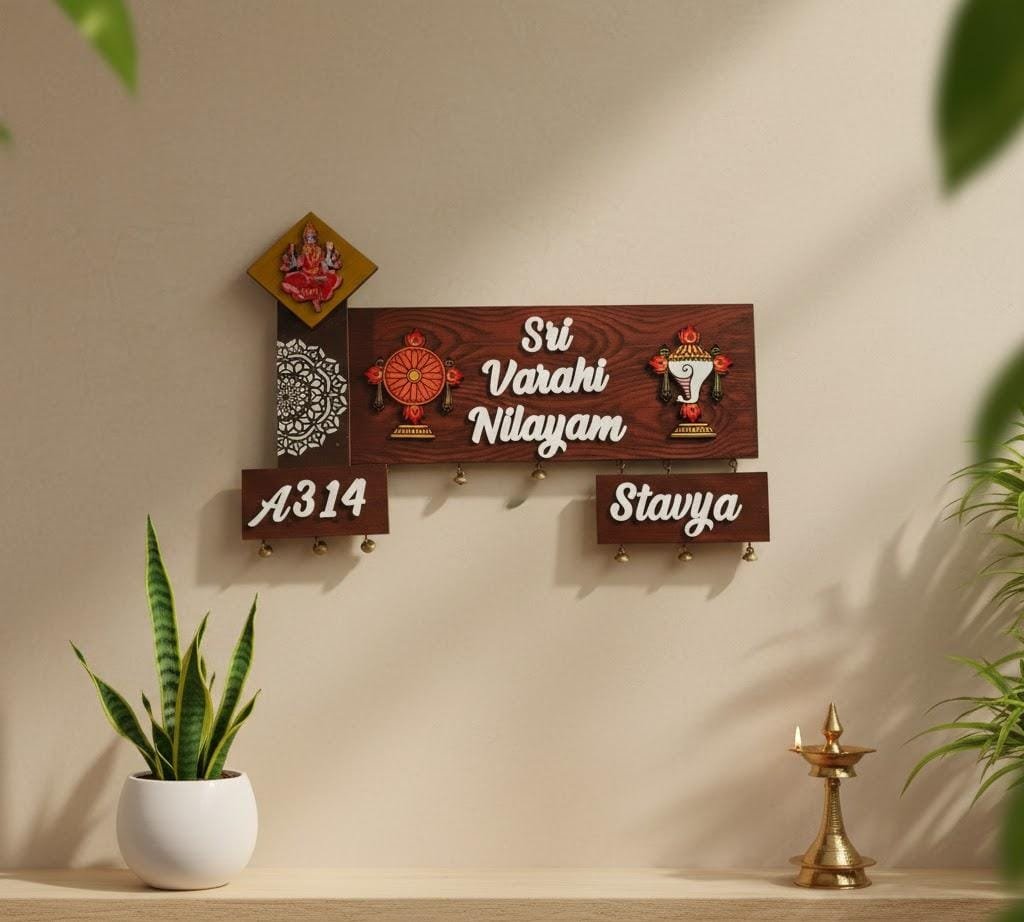 Elegant 3D Embossed Nameplate for your house , with Balaji Images as sublimation on wood . Full work is embossed . This comes with two back hooks and with nice metal bells .