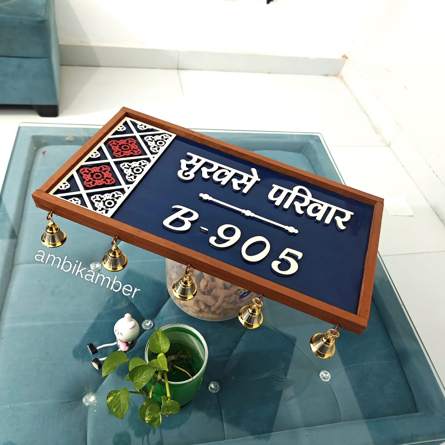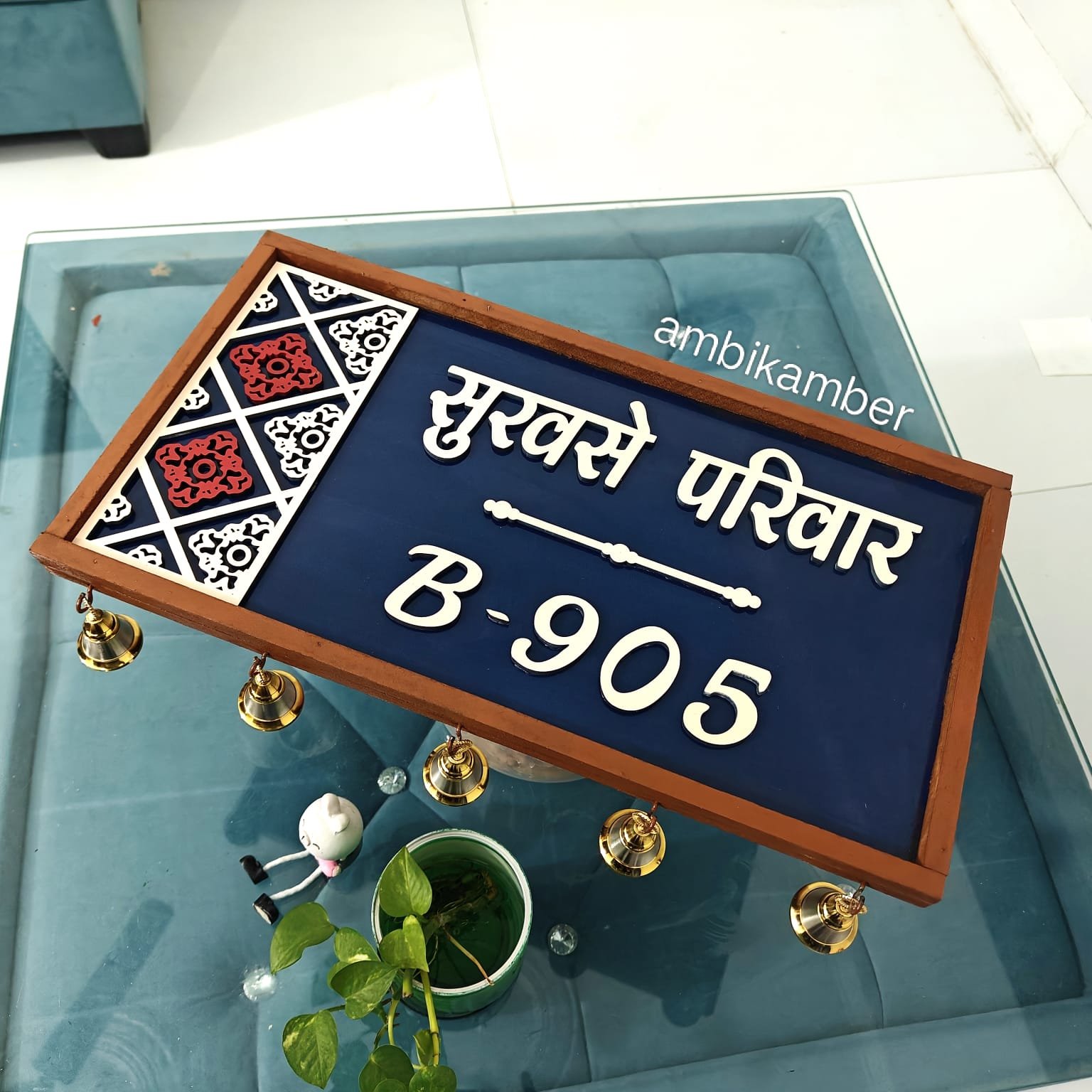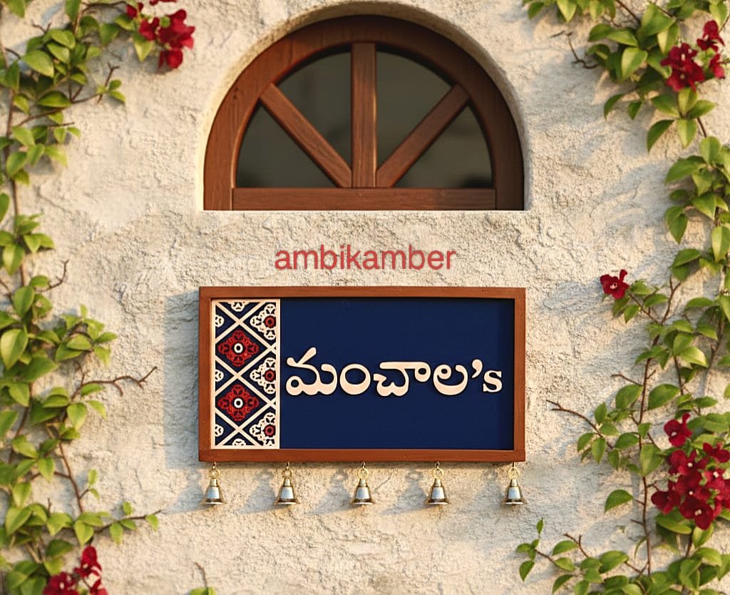 This is nice 17 by 9 inches 3d embossed nameplate with nice jaali cutting work . Comes with brass bells . 2 hooks for hanging purpose .