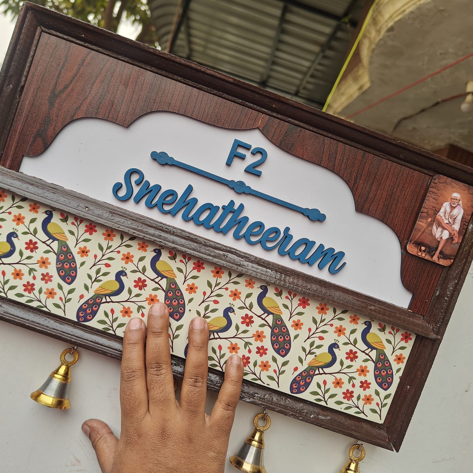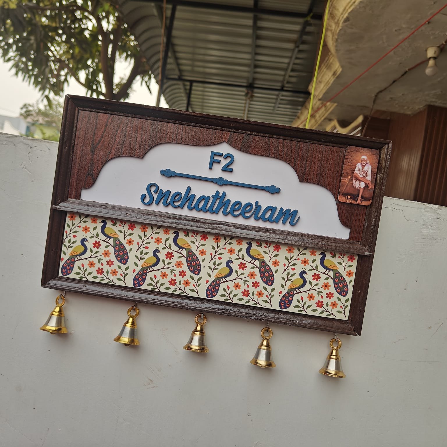 Nice peacock border nameplate . Comes with nice brass bells . If you need any sort of changes to the existing design please feel free to connect with me on 7080480777 .