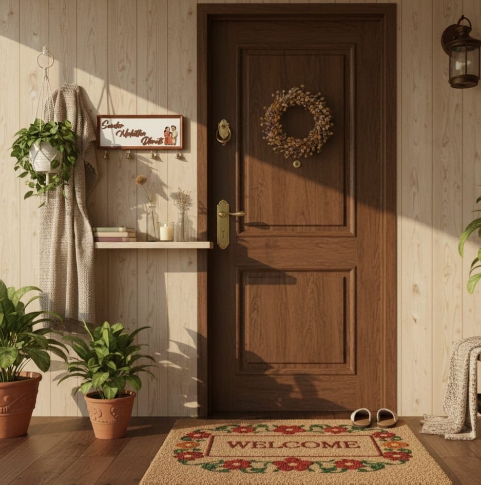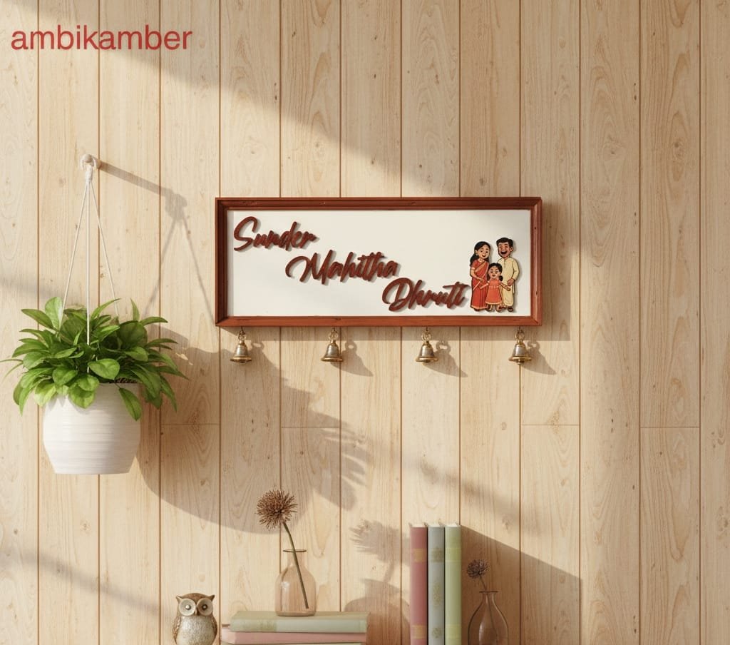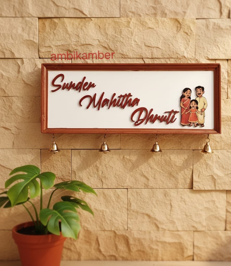 This is a beautiful rectangular frame with two hooks which holds the family picture . This is 18 by 7 inches and comes with brass bells .