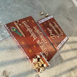 Hi people , this gorgeous piece comes with two brass diya and 1 brass ganesh ji , comes with nice brass bells and golden color craft chains . 3d letters .